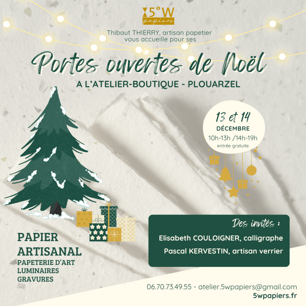 > Samedi 13 et dimanche 14 décembre : Portes ouvertes de l’atelier avec 2 invités : Elisabeth COULOIGNER, calligraphe et Pascal KERVESTIN, artisan verrier. Démonstrations de fabrication de papier, exposition-vente, tombola avec de jolis lots à gagner, douceurs et vin chaud pour être dans l’ambiance de Noël !